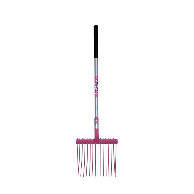 Introducing the Fyna-Lite Groovy Fork in a vibrant pink hue, designed specifically for juniors who love to add a splash of color to their grooming routine. This lightweight yet durable shavings fork is perfect for effortlessly managing bedding and ensuring a clean environment for your equine friends. Its ergonomic design provides a comfortable grip, making it easy for young hands to use, while the sturdy tines efficiently sift through shavings. Elevate your stable experience with this stylish and functional tool that combines practicality with a fun aesthetic.