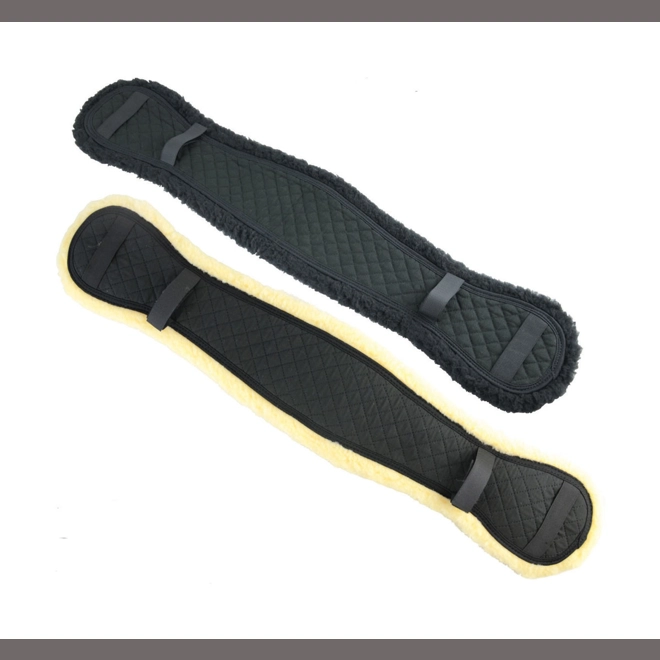 The faux sheepskin fleece provides comfort for the horse and prevents rubbing with a rolled edge. Cotton fabric on the reverse with adjustable straps to easily attach onto the girth.