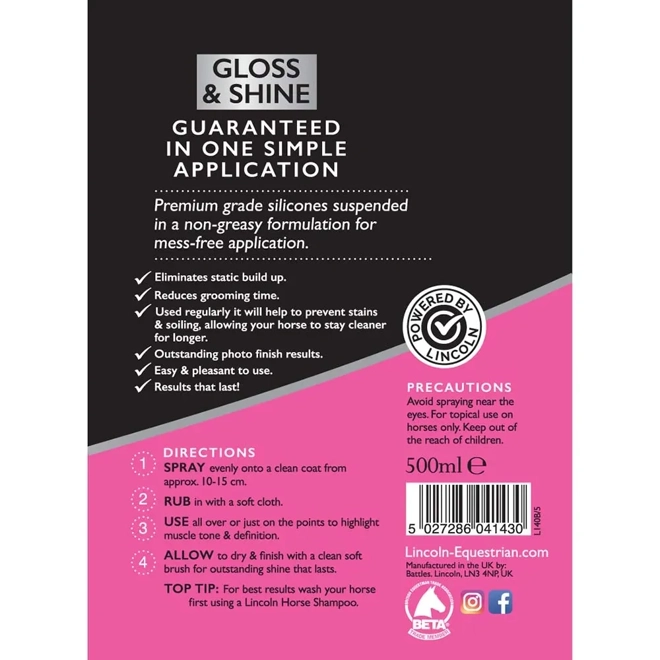Achieve a stunning, long-lasting glossy finish with Lincoln Hair Polish, designed specifically for show ring excellence. This exceptional formula not only creates a brilliant sheen on your horse's coat but also protects the hair while repelling dirt and dust, significantly cutting down grooming time. Enjoy the added benefit of keeping the mane and tail tangle-free, ensuring your equine companion looks their best with minimal effort. Elevate your grooming routine and make every appearance shine with Lincoln Hair Polish.