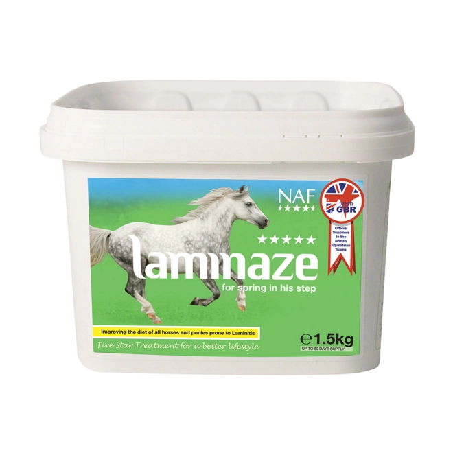 NAF Five Star Laminaze, a revolutionary supplement designed to support your horse's overall health and well-being. Our unique blend of naturally sourced antioxidants, combined with key gut support, bio-available sulphur, and targeted nutrients, creates a palatable formula that not only maintains hoof health but also improves your horse's diet and lifestyle.