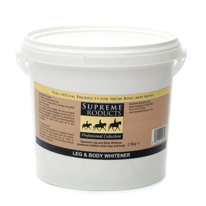 A brilliant white, easy to apply leg and body whitener. Non sticky, it can be added to final rinsing water to whiten body, mane and tail. Usable wet or dry, it will help cover last minute stable stains and in a concentrated liquid form (mixed with water to the consistency of yoghurt), it will produce extremely white legs. For convenience, it can be applied the night before required and leg bandages applied while still wet. On removing, any excess product will come away with the bandages and there is no further requirement to groom the legs.
