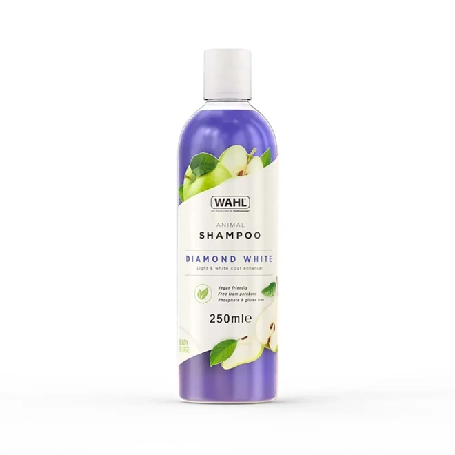Wahl Diamond White Pet Shampoo is expertly crafted to elevate the beauty of white and light-coated pets. Infused with refreshing cucumber, passion flower, lemon, and lime, this professional-grade formula effortlessly removes dirt and stains without the need for harsh scrubbing. Its easy rinse-out feature ensures a soft, manageable coat, while leaving behind a delightful, long-lasting fragrance that keeps your pet smelling fresh. Treat your furry friend to a luxurious grooming experience with Wahl Diamond White Pet Shampoo.